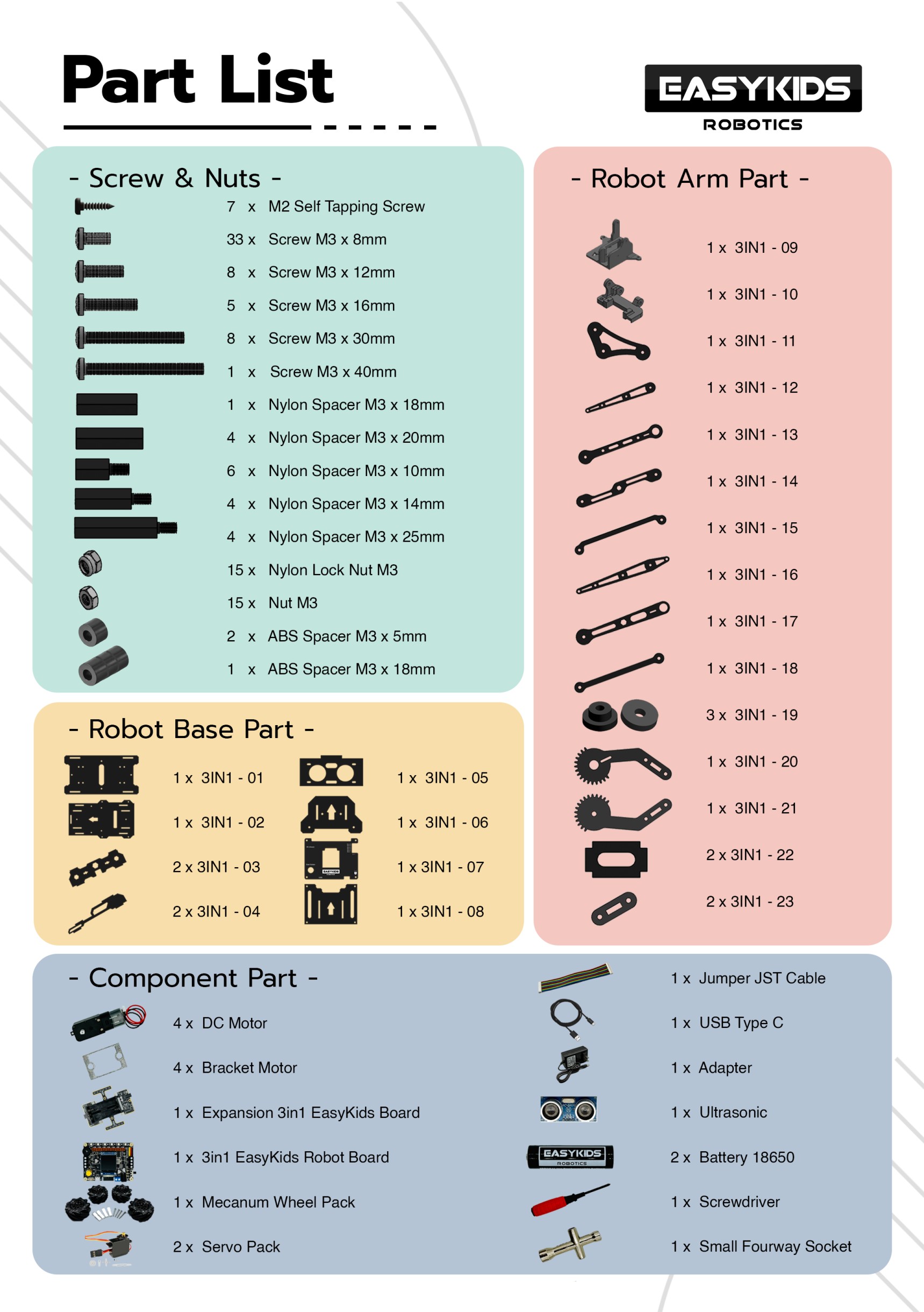 - ชุดโครงสร้างแขนกลและมือจับ จำนวน 17 ชิ้น - มอเตอร์กระแสตรง 6V บัดกรีสายต่อแบบ XH 2P จำนวน 4 ตัว - บอร์ดควบคุมหุ่นยนต์ 3in1 EasyKids Robot จำนวน 1 บอร์ด - บอร์ดขยาย 3in1 EasyKids Robot จำนวน 1 บอร์ด - ล้อ Mecanum จำนวน 4 ล้อ - ฉากยึดมอเตอร์อลูมิเนีม จำนวน 4 ตัว - ข้อต่อล้อ Mecanum จำนวน 4 ชิ้น - เซอร์โวมอเตอร์แรงบิด 12g พร้อมชุดก้านเซอร์โว จำนวน 2 ชุด - สาย Connector EasyKids Expansion Power จำนวน 1 ชุด - เซนเซอร์ Ultrasonic HC-04S จำนวน 1 ตัว - ถ่านชาร์จขนาด 18650 3.7V 20000mAh จำนวน 2 ก้อน - อะแดปเตอร์ชาร์จ 8.4V 2A จำนวน 1 เครื่อง - สาย USB Type C จำนวน 1 เส้น - ไขควงแฉก จำนวน 1 อัน - ประแจหกเหลี่ยม 4 หัว M2, M2.5, M3, M4 จำนวน 1 อัน - ชุดน๊อตสกรูและเสารอง จำนวน 1 ชุด